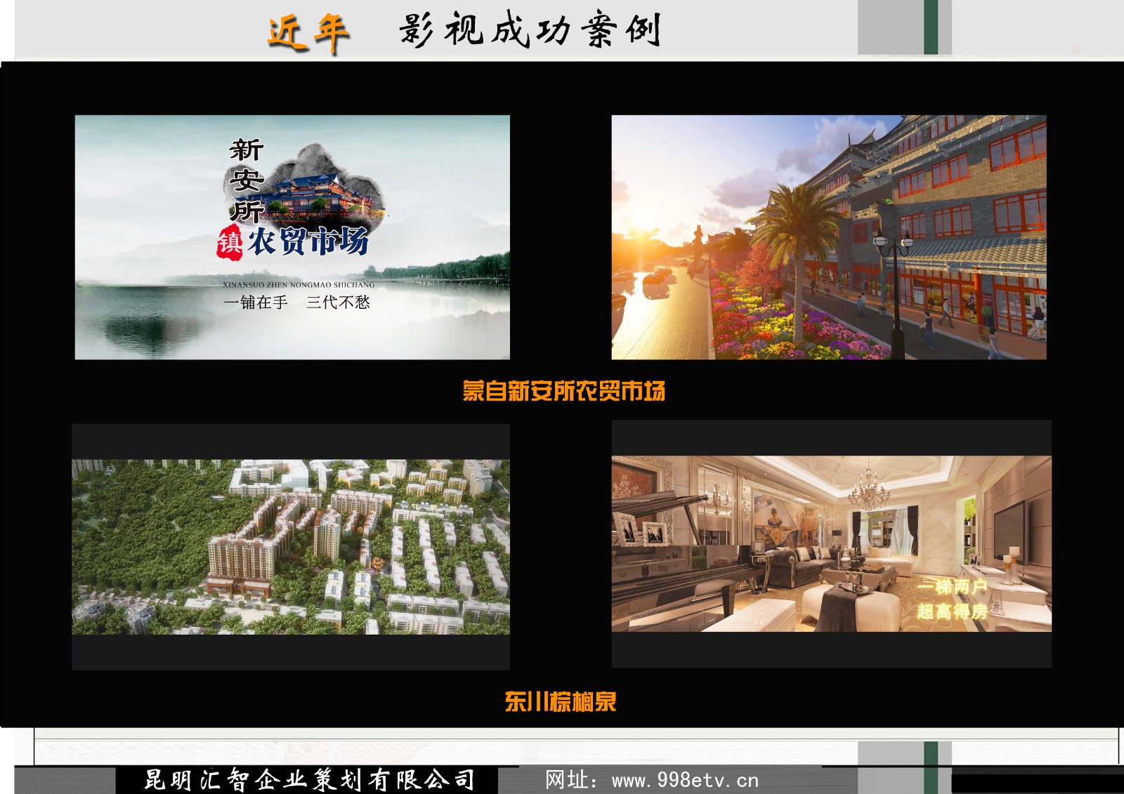 昆明汇智企业策划有限公司以高技术为本,拥有一批计算机及策划设计领域的高素质人才,致力于云南省广告制作、专题片策划拍摄、电视三维片头、动漫设计、建筑工程项目,BIM建模技术咨询服务、多媒体设计制作,游戏场景开发、地理信息智慧城市三维建模、音视频专业电视设备,计算机网络,自动化系统的开发、科研、销售及技术培训服务,成立25年来一直为云南省电视台、昆明电视台、各地州电视台设计制作了大量的片头及影视后期制作,获得了各界的好评,同时为各大企事业单位制作了许多成功的电视策划如:世博会专题、云南省公路局、铁道部疾病防治中心、云南专卖局、昆明劳动和社会保障局、昆明市公安局、云南省公安厅、云南农垦、云南教育出版社;昆明理工大、云南中医学院、昆明医科大学第二附属医院、昆明医学院附属医院皮肤科、南药制药;昆明市盘龙区宣传片、新西南商厦、一汽红塔,康发家私、鸡足山、云内动力、云天化、三环化工公司,联通通信,云南航天、云南铜业;盘龙地产、中国建筑2局、葛洲坝水利工程局、云南官房地基工程公司、太平洋保险、,中国建筑工程2局,官渡区房地产公司、澜沧江水利开发公司、昆明万科房地产公司、昆明三联置业公司、西安 铂悦,贵州建工集团、四川永亨实业,泰国普吉岛阳光海岸酒店等数百家企业\事业单位。
